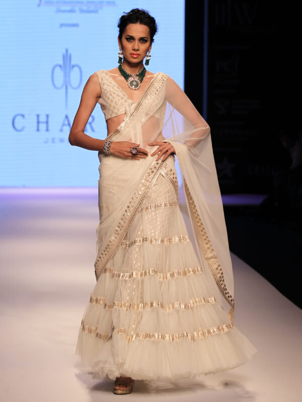 An ethereal ivory saree by Aslam Khan Couture, showcased at IIJW. Crafted in fine net and silk-blend fabric with layered tulle pleats, gold sequin bands, and a hand-embroidered crystal border.