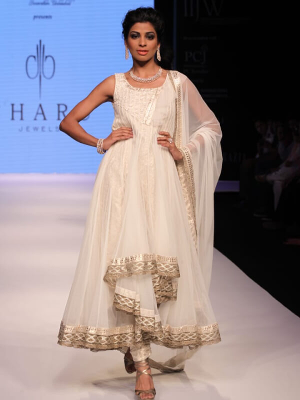 This stunning ivory Anarkali from Aslam Khan Couture exudes timeless grace, adorned with delicate gold embroidery and layered net detailing.