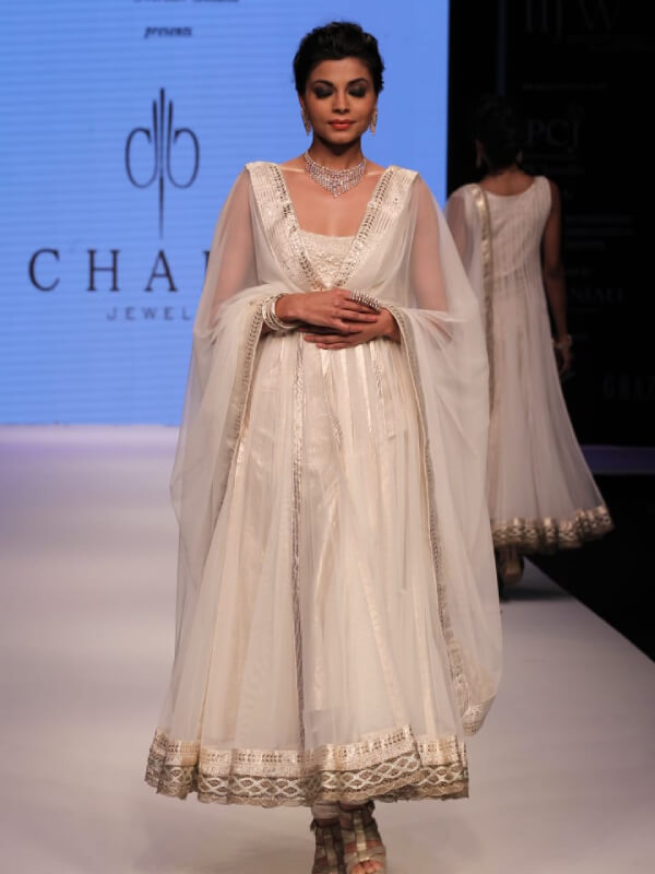 A regal silhouette from Aslam Khan Couture, this ivory Anarkali features a deep V-cut bodice with intricate gold thread embroidery, flowing into a rich net flare. The sheer dupatta is styled cape-like, enhancing the elegance and drama of the ensemble.